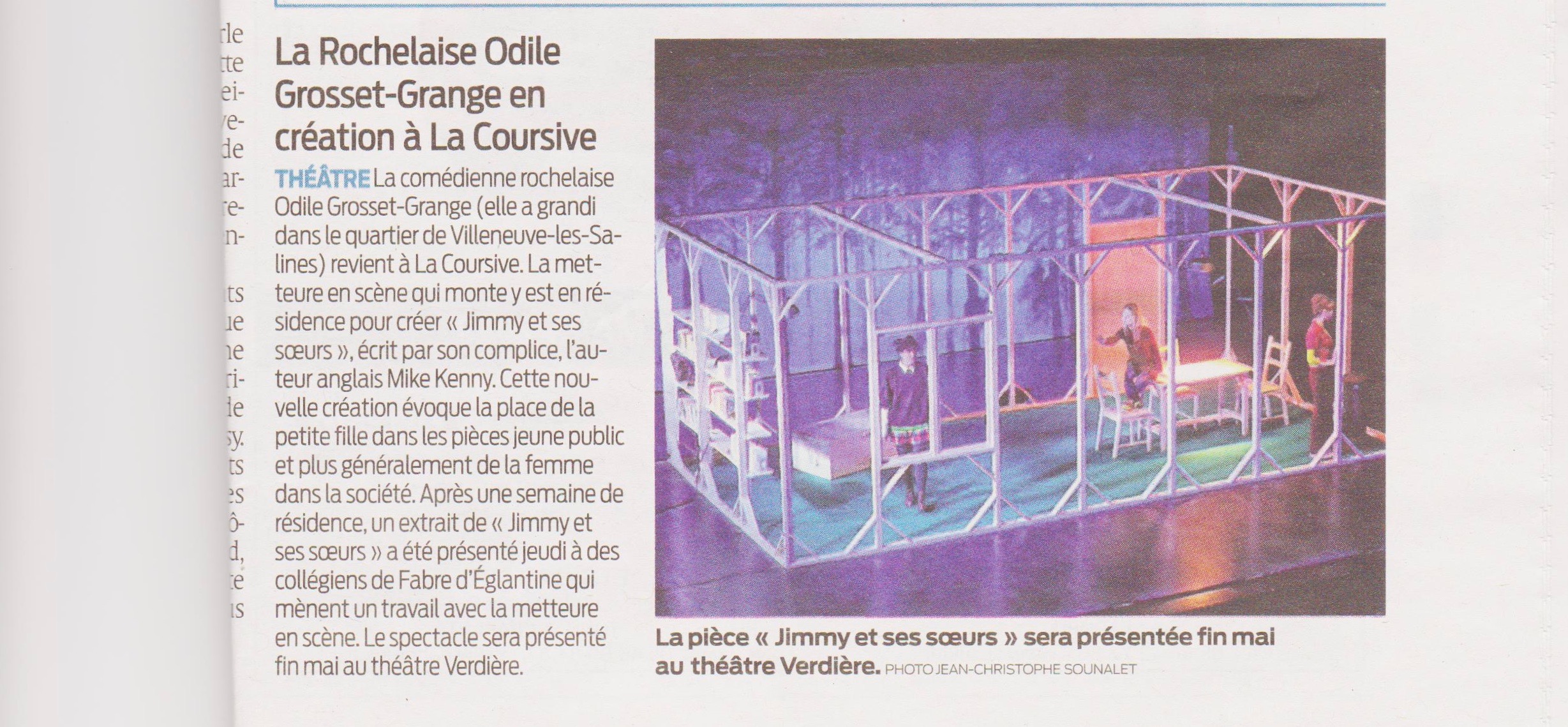 La comédienne rochelaise Odile Grosset-Grange (elle a grandi dans le quartier de Villeneuve-les-Salignes) revient à La Coursive. La metteure en scène qui monte y est en résidence pour créer « Jimmy et ses sœurs », écrit par son complice, l’auteur anglais Mike Kenny. Cette nouvelle création évoque la place de la petite fille dans les pièces jeune public et plus généralement de la femme dans la société. Après une semaine de résidence, un extrait de « Jimmy er ses sœurs » a été présenté jeudi à des collégiens de Fabre d’Eglantine qui mènent un travail avec la metteure en scène. Le spectacle sera présenté fin mai au théâtre Verdière.