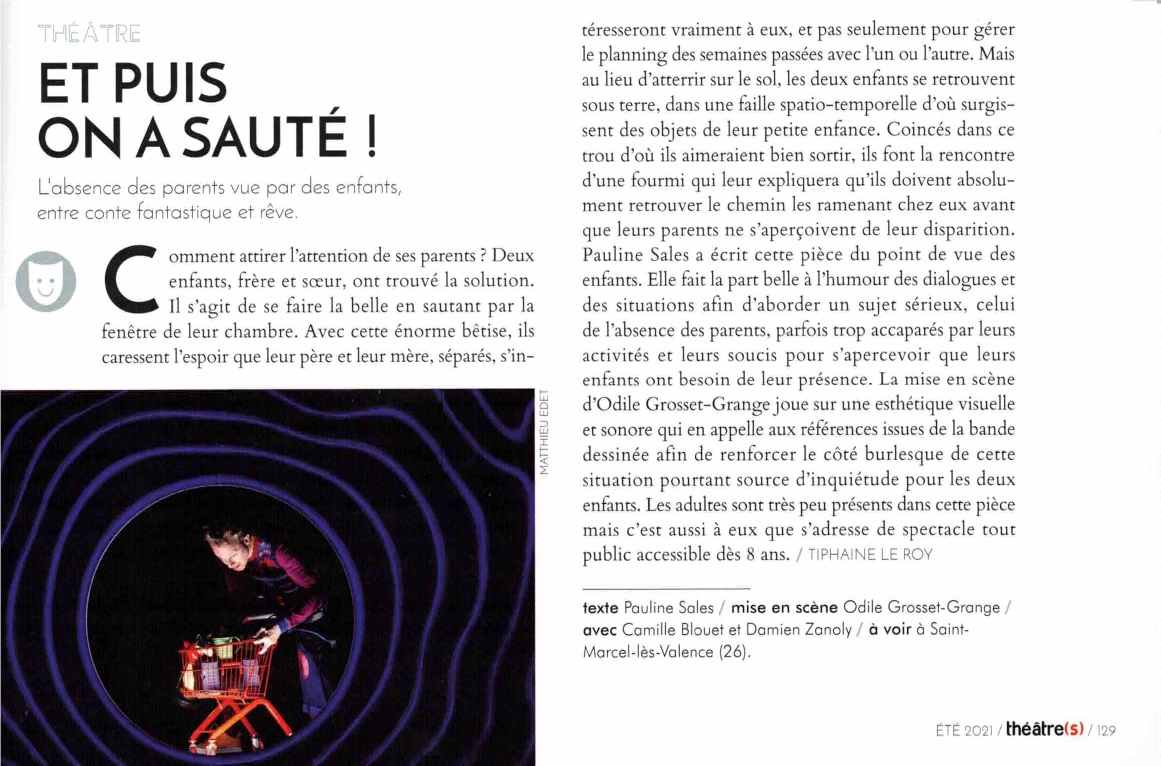 Comment attirer l’attention de ses parents ? Deux enfants, frère et sœur, ont trouvé la solution. Il s’agit de se faire la belle en sautant par la fenêtre de leur chambre. Avec cette énorme bêtise, ils caressent l’espoir que leur père et leur mère, séparés, s’intéresseront vraiment à eux, et pas seulement pour gérer le planning des semaines passées avec l’un ou l’autre. Mais au lieu d’atterrir sur le sol, les deux enfants se retrouvent sous terre, dans une faille spatio-temporelle d’où surgissent des objets de leur petite enfance. Coincés dans ce trou d’où ils aimeraient bien sortir, ils font la rencontre d’une fourmi qui leur expliquera qu’ils doivent absolument retrouver le chemin les ramenant chez eux avant que leurs parents ne s’aperçoivent de leur disparition. Pauline Sales a écrit cette pièce du point de vue des enfants. Elle fait la part belle à l’humour des dialogues et des situations afin d’aborder un sujet sérieux, celui de l’absence des parents, parfois trop accaparés par leurs activités et leurs soucis pour s’apercevoir que leurs enfants ont besoin de leur présence. La mise en scène d’Odile Grosset-Grange joue sur une esthétique visuelle et sonore qui en appelle aux références issues de la bande dessinée afin de renforcer le côté burlesque de cette situation pourtant source d’inquiétude pour les deux enfants. Les adultes sont très peu présents dans cette pièce mais c’est aussi à eux que s’adresse ce spectacle tout public accessible dès 8 ans.