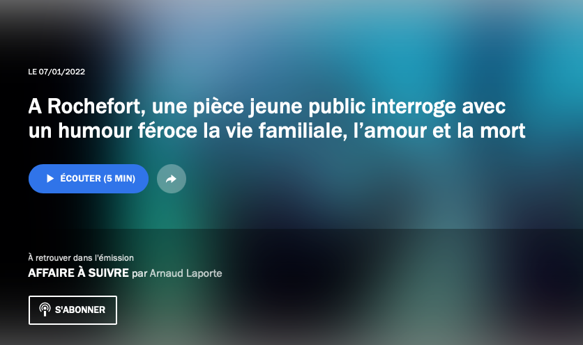 Emission disponible ici : https://www.franceculture.fr/emissions/affaire-a-suivre/a-rochefort-une-piece-jeune-public-qui-interroge-avec-un-humour-feroce-la-vie-familiale-l-amour-et-la-mort