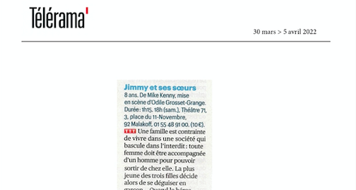 TTT Une famille est contrainte de vivre dans une société qui bascule dans l’interdit : toute femme doit être accompagnée d’un homme pour pouvoir sortir de chez elle. La plus jeune des trois filles décide alors de se déguiser en garçon… Quand le héros d’une histoire est une héroïne masquée ; quand le quotidien de trois sœurs sombre dans la peur et l’enfermement, cela donne, sous la plume de Mike Kenny et la mise en scène d’Odile Grosset-Grange, un texte entre récit et jeu (les comédiennes sont tour à tour narratrices et personnages), et un spectacle où sont abordées avec finesse et humour les questions du pouvoir, des rapports hommes-femmes et de la liberté.