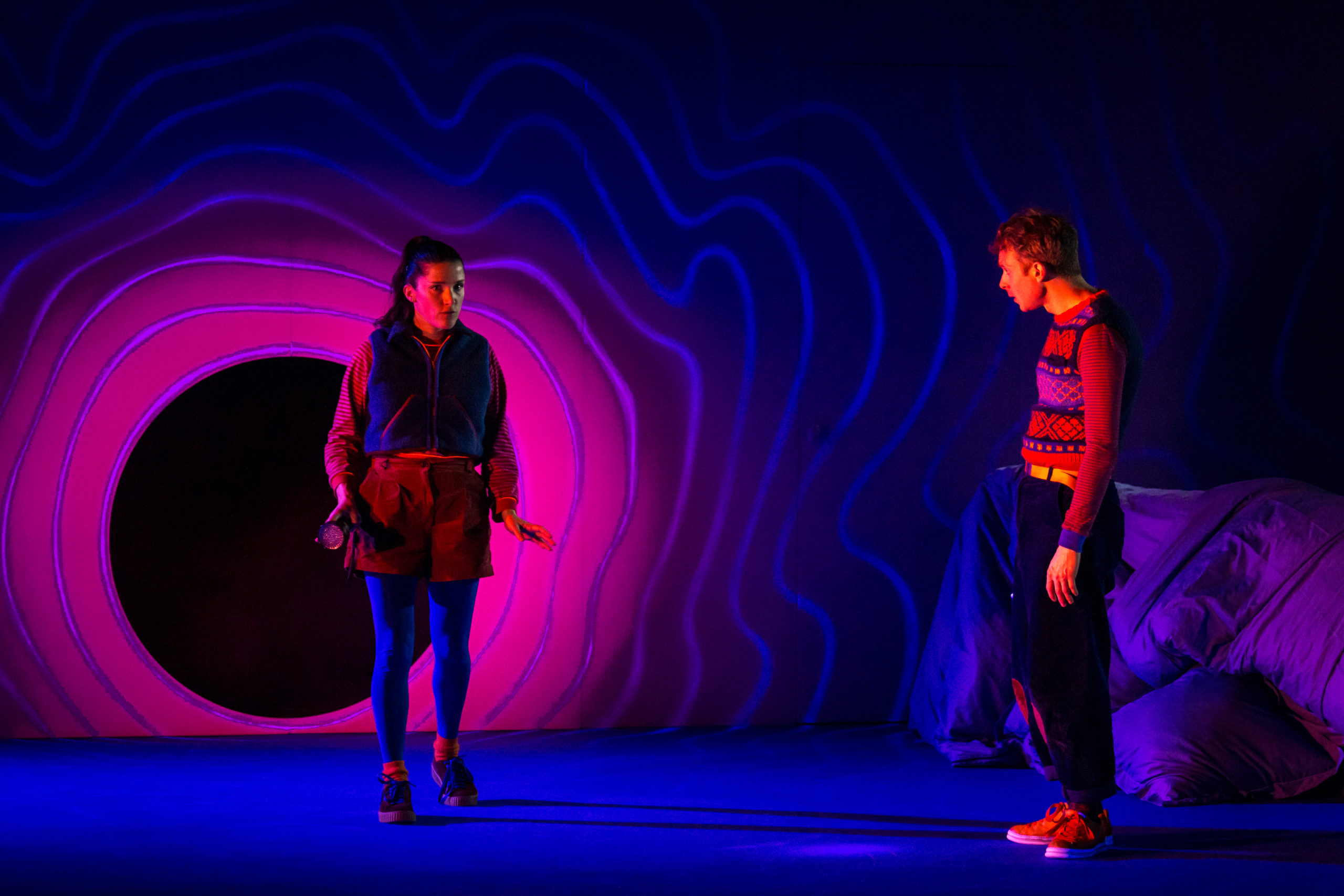Le trou va finalement devenir l’espace idéal pour se questionner sur ce qui les travaille dans le fond, le manque, la relation avec leurs parents, leur confiance et leur inquiétude face à la vie, la mort, l’amour, l’avenir. Dans ce trou, passé, présent et futur se télescopent de manière ludique. Seulement il y a urgence. Il faut à tout prix arriver à rejoindre la maison et reprendre le cours de sa vie. Ce voyage initiatique au pays du trou les fera grandir d’un coup. Revenus dans leur chambre ce sera leur mère qui sera en manque d’eux. Le temps aurait-il passé si vite qu’elle se retrouverait maintenant avec deux adolescents ? »